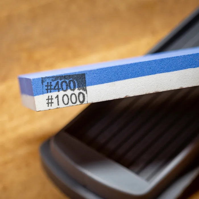 Smith's 6" DualGrit double-sided whetstone offers 400 grit and 1,000 grit in one stone. The new 6˝ x 1.75˝ sized whetstone rests in a plastic base and has a plastic lid to protect the stone when not in use. During use, the plastic lid can be inserted into the bottom of the stone base to extend the height of the base and make sharpening your knife safer. The user’s fingers grip lower on the base and remove any chance of cutting your fingers when pulling or pushing the knife’s cutting edge across the sharpening surface.