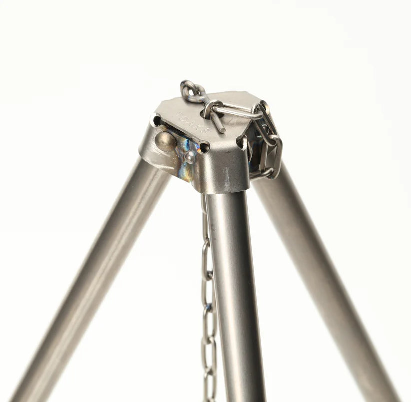 Ultralight TOAKS Pure Titanium Portable Cooking Tripod, weighing only 7oz / 200g! The adjustable design features a pure titanium construction, stable 3-Legs design with a chain and S hook that can be raised or lowered for optimum temperature for warming or cooking. The lightweight and the collapsible design make it ideal for backpacking, camping, fishing and hunting trips, or beach/lake outing! It's excellent for hanging cooking pots, tea kettles, coffee pots, etc. It also works great for hanging lanterns, suspending water jugs, or dry clothes. The titanium construction is built to last. It boasts safe, easy set up and storage space-saving.