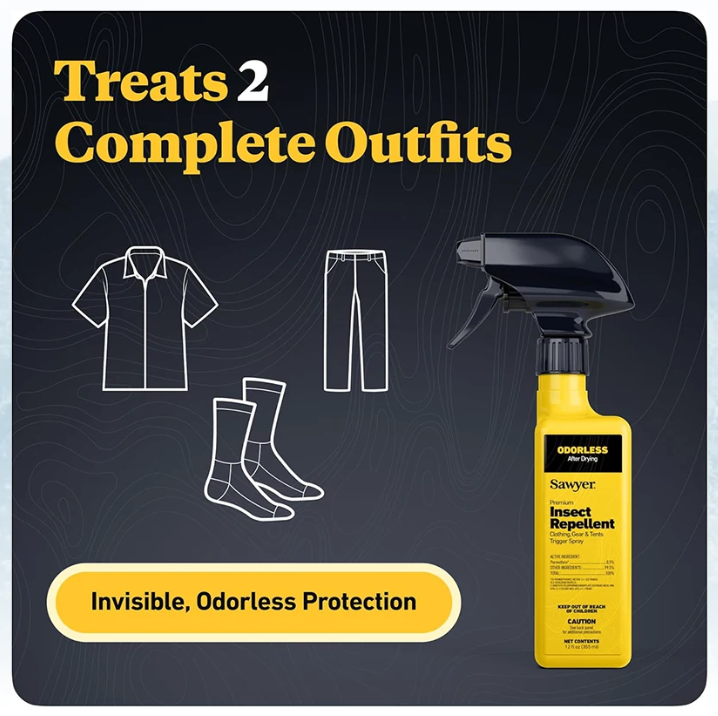 For use on clothing, tents, sleeping bags, and other outdoor gear, Sawyer Permethrin repels or kills disease-spreading ticks (Lyme disease), mosquitoes (West Nile and Zika viruses) and more than 55 other kinds of insects. Perfect for camping, backpacking, hunting, travel, backyard BBQs, picnics, and more, Permethrin insect and tick repellent adds an odorless layer of protection to shirts, jackets, pants, socks, shoes, sleeping bags, tents, netting, and other outdoor, camping, hunting, and travel gear.