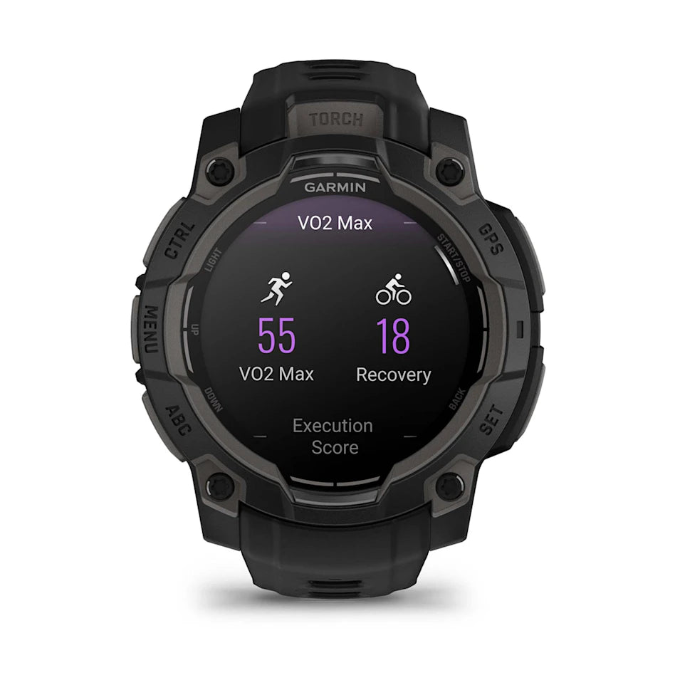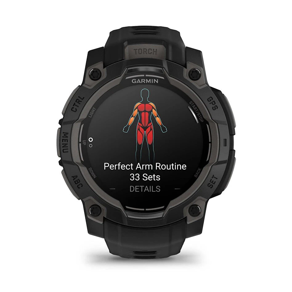 Instinct 3 is the rugged 45 mm GPS smartwatch with a 1.2" AMOLED display, a built-in flashlight and up to 18 days of battery life in smartwatch mode. With bolted construction, a metal-reinforced bezel and scratch-resistant lens, it can take on your toughest adventures. It's engineered to MIL-STD-810 standards for thermal and shock resistance and is also 10 ATM water-rated. To keep you on track, the Instinct 3 smartwatch includes a built-in 3-axis compass and barometric altimeter. Plus, multi-band GPS with SatIQ technology delivers superior positioning while also optimising battery life. Its 24/7 health and wellness features keep you connected to your body with heart rate tracking, advanced sleep monitoring, Pulse Ox and more *(this is not a medical device, and data presented is intended to be a close estimation of metrics tracked; Pulse Ox not available in all countries).* Instinct 3 also includes Garmin Pay contactless payments (with a supported bank).