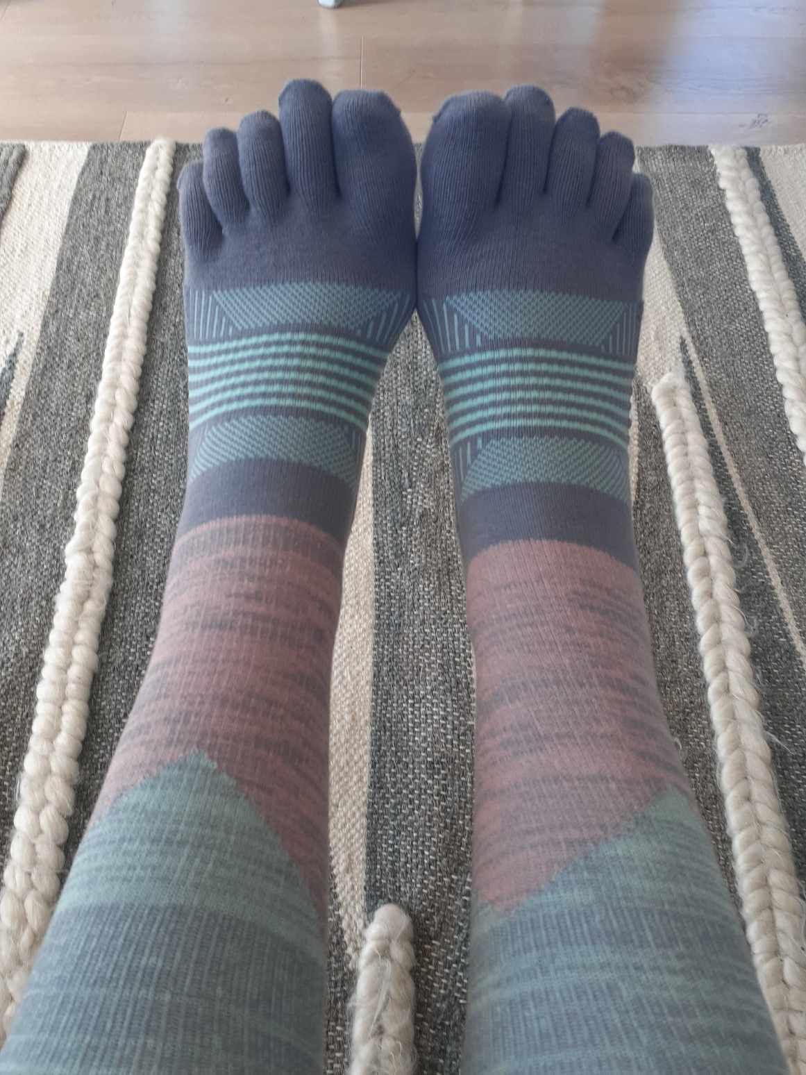 A friend recommended getting toe socks and I have to say, amazing results. No blisters over a multi-day tramp (well broken in boots, but still!) Feet didn’t get cold or overheat either. Lovely design too, nice to have something pretty.