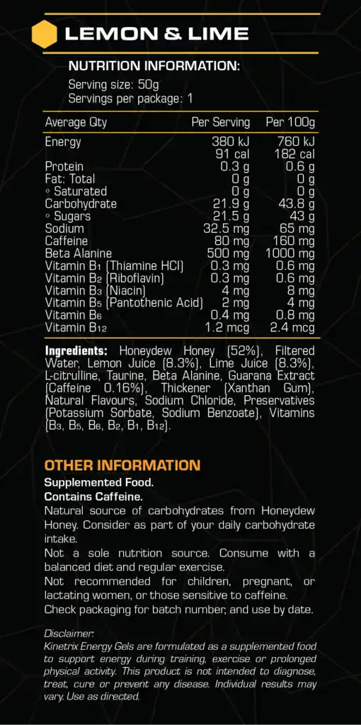 Kinetrix Endurance Energy Gel is built for athletes who demand sustained power, sharp decision-making, and reliable recovery. Powered by native honeydew honey and elevated with Guarana caffeine, B-vitamins, Taurine, and performance amino acids, it delivers clean, steady energy without the spike-and-crash cycle. This is fuel that works with your body – keeping your head clear and your output consistent when it matters most.