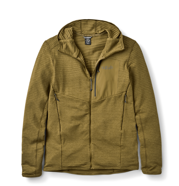 - Lightweight fabric with alternating stripes of high and low lofting fleece for warmth in low bulk package with increased airflow