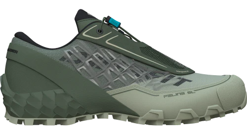 With its deep, aggressive tread, the Feline SL running shoe for women guarantees optimum traction on soft and muddy surfaces. The shoe is a proven DYNAFIT bestseller and a true Swiss army knife for every trail adventure. The Feline SL is an impressive, versatile, sturdy companion that will keep you feeling totally great on soft surfaces as well as on mud and snow. In particularly suitable for middle distances, the Feline SL GTX scores big for its responsiveness, ideal traction, and well-balanced cushioning. The POMOCA outsole boasts a blend of lateral stability at the forefoot, excellent grip in the mid-foot area, and at the same time improved traction at the toes and heel - even on wet or slick surfaces. Its drop is 8 mm, guaranteeing good support and dynamic power. The Sensitive Fit of the shoe offers you a precise, comfortable fit and assists in a natural roll-through into toe-off. The Feline SL’s Quick Lacing System is combined with the protection of the DYNAFIT Invisible Lacing Technology. With that you can on the one hand lace your shoe quickly and precisely. On the other hand, the protective stretch lace cover ensures that no rocks and dirt get into your shoe and that the laces remain safely stowed. Additional features of this trail running shoe include an injection-molded TPU toe cap to decrease the effect of impacts on the toes and forefoot. In addition, what DYNAFIT calls a “Heel Preloader” – a diagonal reinforcement at the heel – improves overall hold.