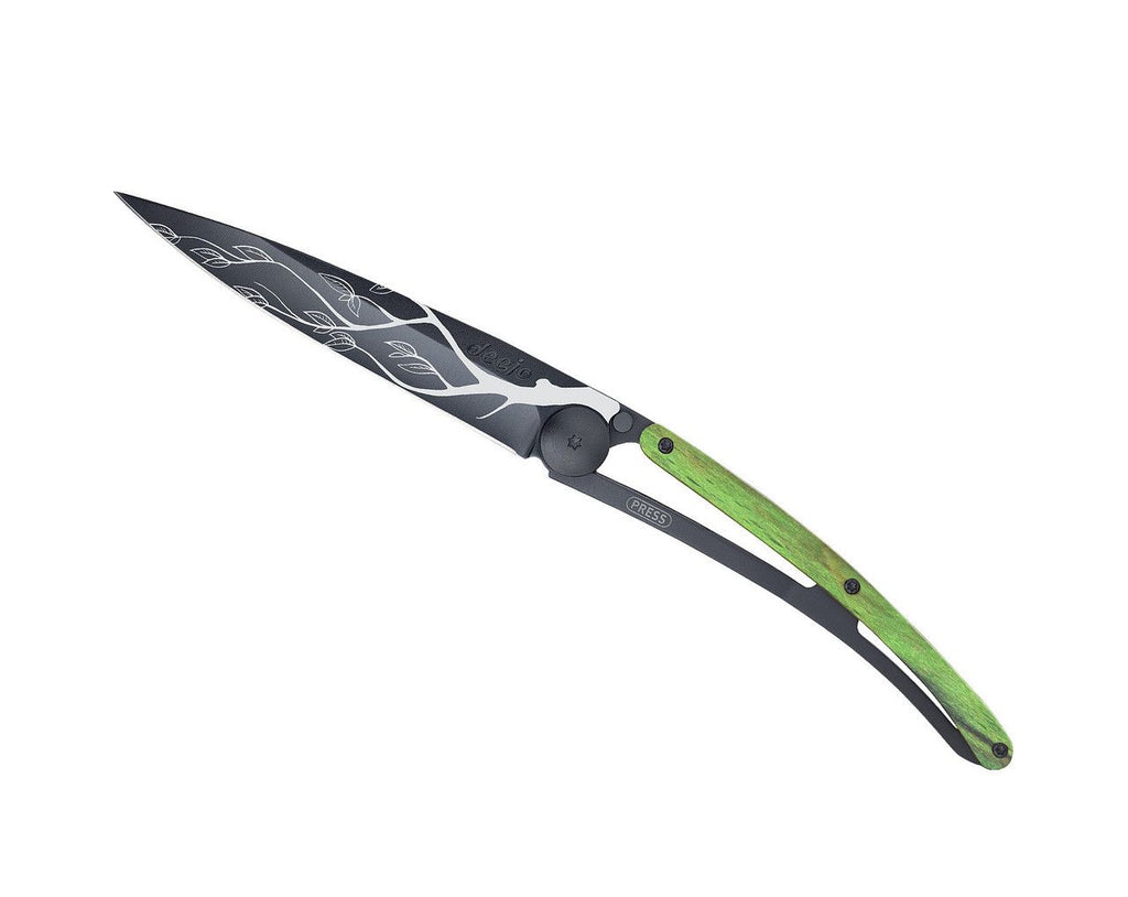 Deejo Black 37g Knife with Green Beech Wood Handle, Tree