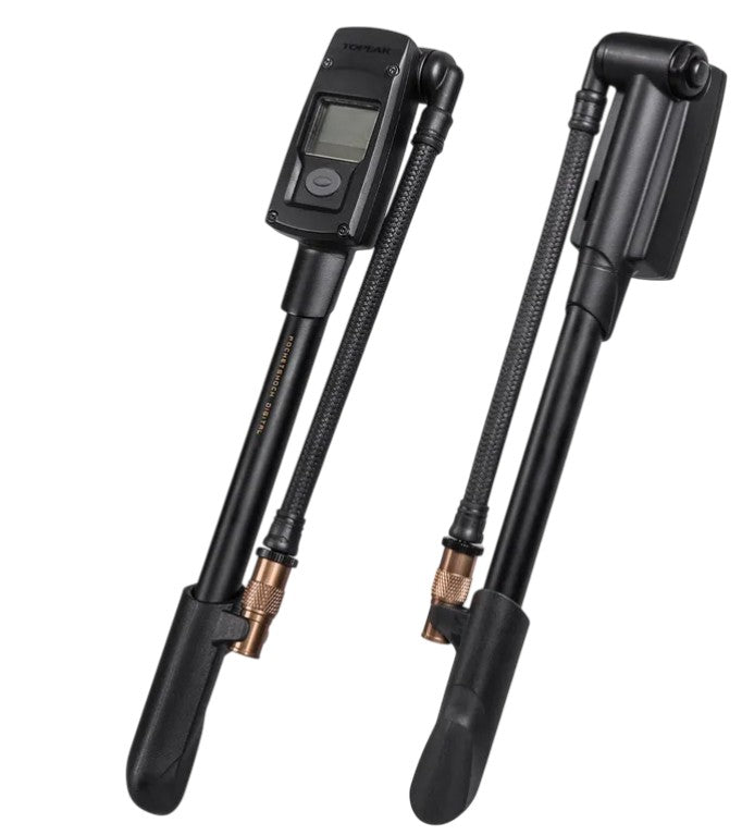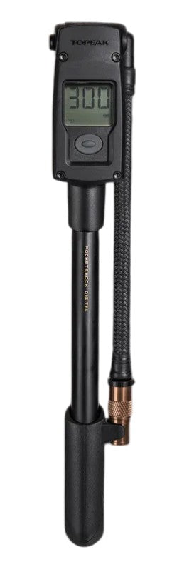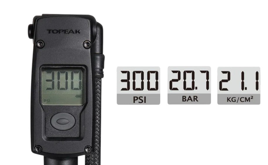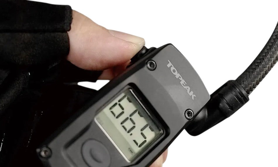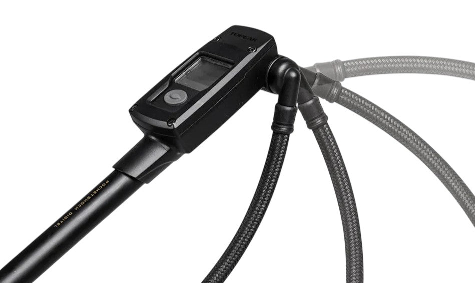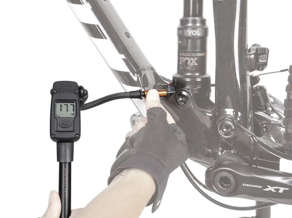 A compact shock pump with easy-to-read digital gauge delivering accurate pressure readings up to 300psi / 20.7bar. The Pressure-Rite connector and air release button make dialing in your pressure quick and easy, and there is no pressure loss when removing the connector while the rotating hose take stress off the valve stem when inflating.