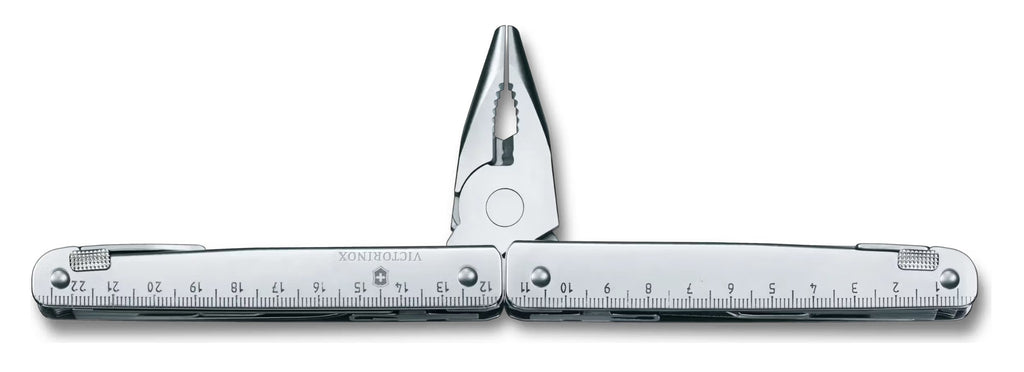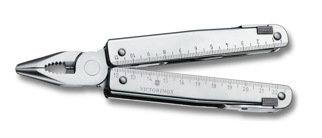Needle-nose pliers / Wire cutter for thin and soft wire up to 40 HRc / Hard wire cutter / Wire crimper / Blade, large / Can opener / Screwdriver 3 mm / Bottle opener / Screwdriver 5 mm / Wire bender / Screwdriver 2 mm / Reamer, punch / Scissors / Wood saw / Metal saw / Metal file / Phillips screwdriver 1/2 / Ruler (cm) / Ruler (in) / Chisel 7 mm and scraper / Wire stripper / Wire scraper / Screwdriver 7.5 mm / Crate opener, sturdy / Lanyard hole / Coupling for corkscrew and carry clip
